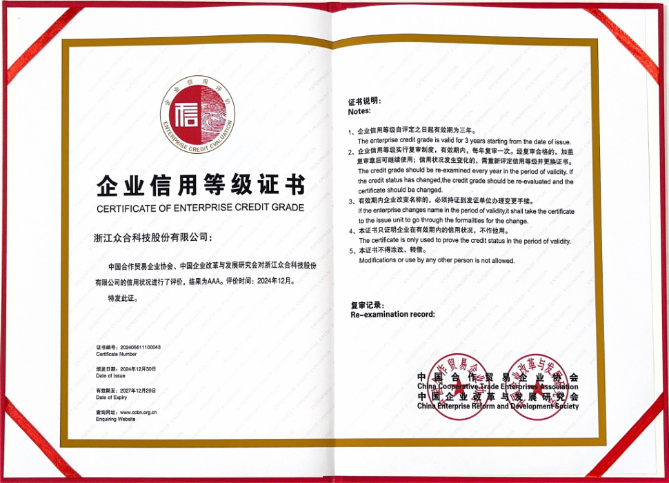 在新一輪科技革命與產業(yè)變革浪潮中,誠信經營是企業(yè)長久生存與發(fā)展的根基,亦是立于不敗之地的核心。長久以來,眾合科技始終嚴格履約踐諾,將誠信理念貫穿在營銷、管理、生產等各個環(huán)節(jié),憑借健全的信用管理體系、優(yōu)良的合同履約信用狀況和良好的市場信譽,榮獲了“2023年浙江省AAA級守合同重信用企業(yè)”等榮譽,展現了公司在推動行業(yè)信用體系建設中的卓越表現。