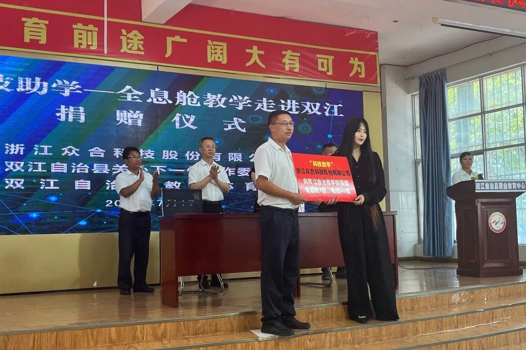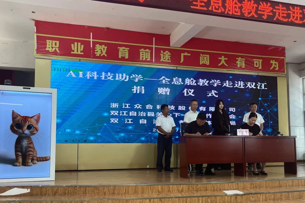 7月初,當(dāng)臨滄市委書記杜建輝率團(tuán)考察眾合科技時,雙江自治縣便與眾合科技達(dá)成了戰(zhàn)略合作,雙方約定在科技助學(xué)、科技助農(nóng)、自然資源保護(hù)開發(fā)及茶產(chǎn)業(yè)數(shù)字化等領(lǐng)域展開深度合作。基于這一合作共識,今日,云南省臨滄市雙江自治縣職業(yè)教育中心報(bào)告廳內(nèi),“AI科技助學(xué)——全息艙教學(xué)走進(jìn)雙江”捐贈儀式溫暖啟幕。這不僅是眾合科技ESG行動計(jì)劃的又一次重要實(shí)踐,更為雙江自治縣的教育與農(nóng)業(yè)發(fā)展注入了新的科技動能。